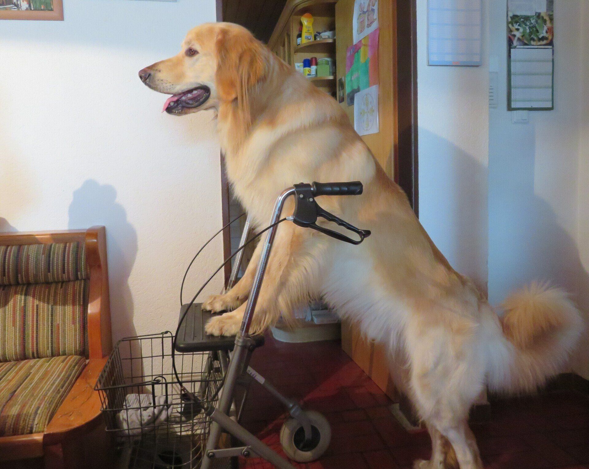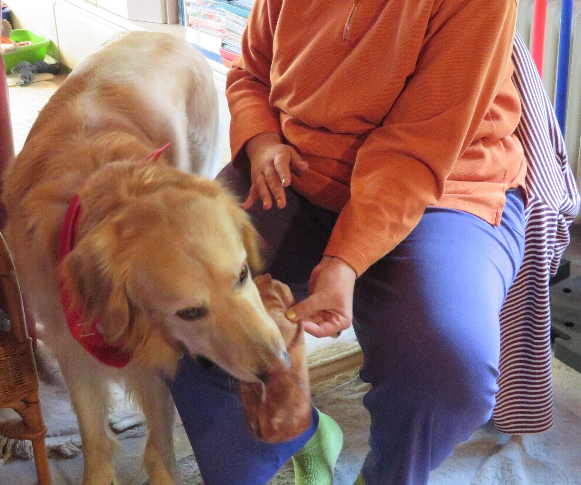 Ich werde an alles mögliche gewöhnt: an Krücken, Rollator, Rollstuhl, Greifzange in möglichen und unmöglichen Positionen, lerne anständig ein Leckerchen aus der Hand, vom Handschuh oder vom Löffel zu nehmen, ich werde heftig durchgeknuddelt an allen Körperstellen, ziehe sogar selbst Söckchen an. Ich kann sogar bei Frauchen oder Tamara oder irgendwem Socken ausziehen....und bringe sie dann in den Wäschekorb.....ich apportiere ja so gerne!!