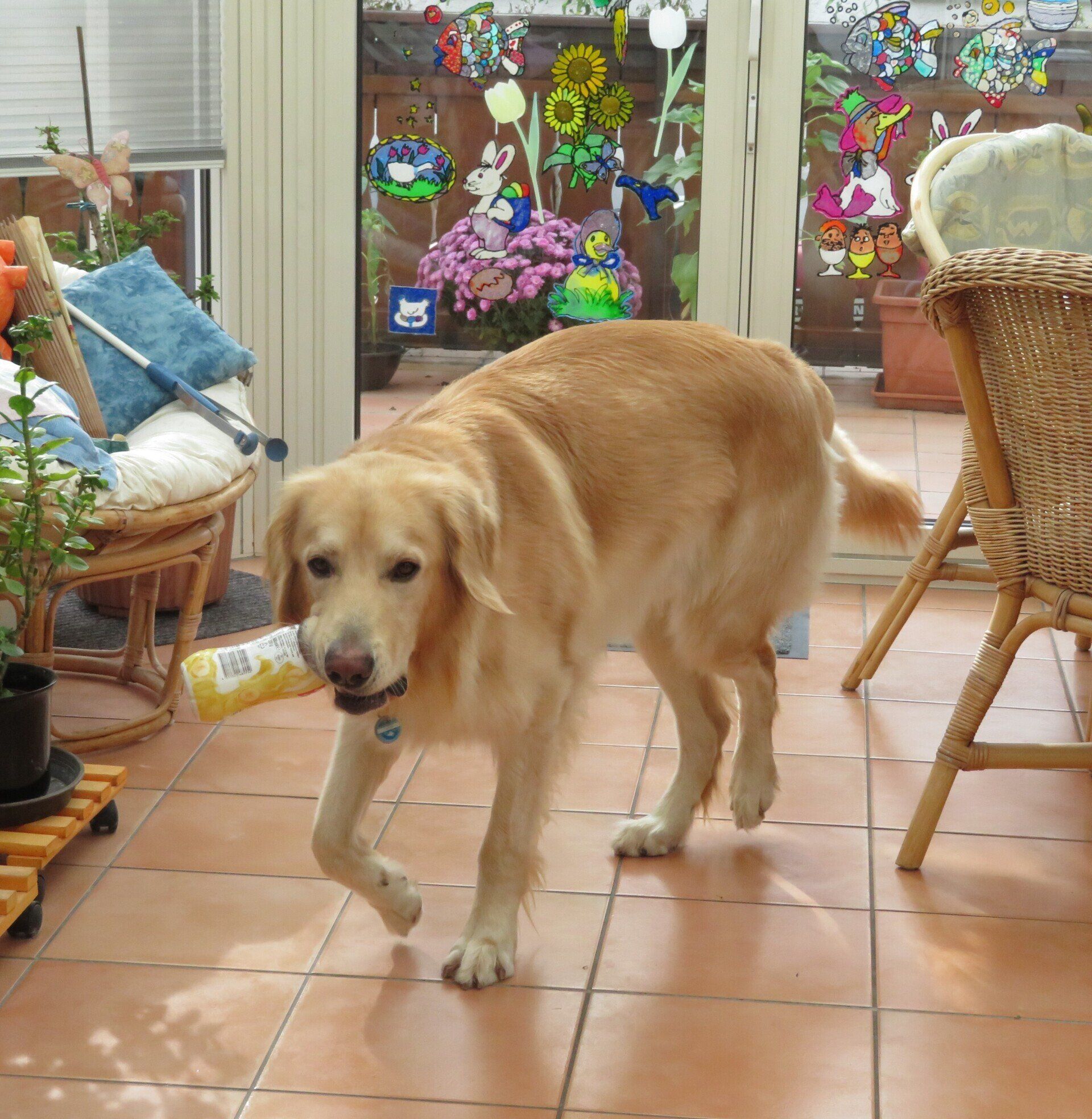Oktober 2022 - meine Tamara sitzt am Frühstückstisch und isst Brötchen mit Nutella....dann ein tonischer Anfall, sie klappt zusammen und ihr fällt das Frühstücksmesser unter den Tisch ganz zwischen den Tischbeinen, den Eckbankbeinen um die Ecke an die hinterste Stelle. Frauchen konnte gerade noch das Brötchen und den Teller retten! Tamara war immer noch verwirrt, Frauchen musste bei ihr bleiben, nicht das noch mehr vom Tisch fällt. Frauchen ruft: bring das Messer und ich flitze los und krabbel unter den Tisch . Ganz vorsichtig nehme ich es am Kunststoffgriff ins Maul und bringe es ihr direkt in die Hand. Frisch abgewaschen, und meine Tamara konnte weiter frühstücken! - FEINER HANNES!!