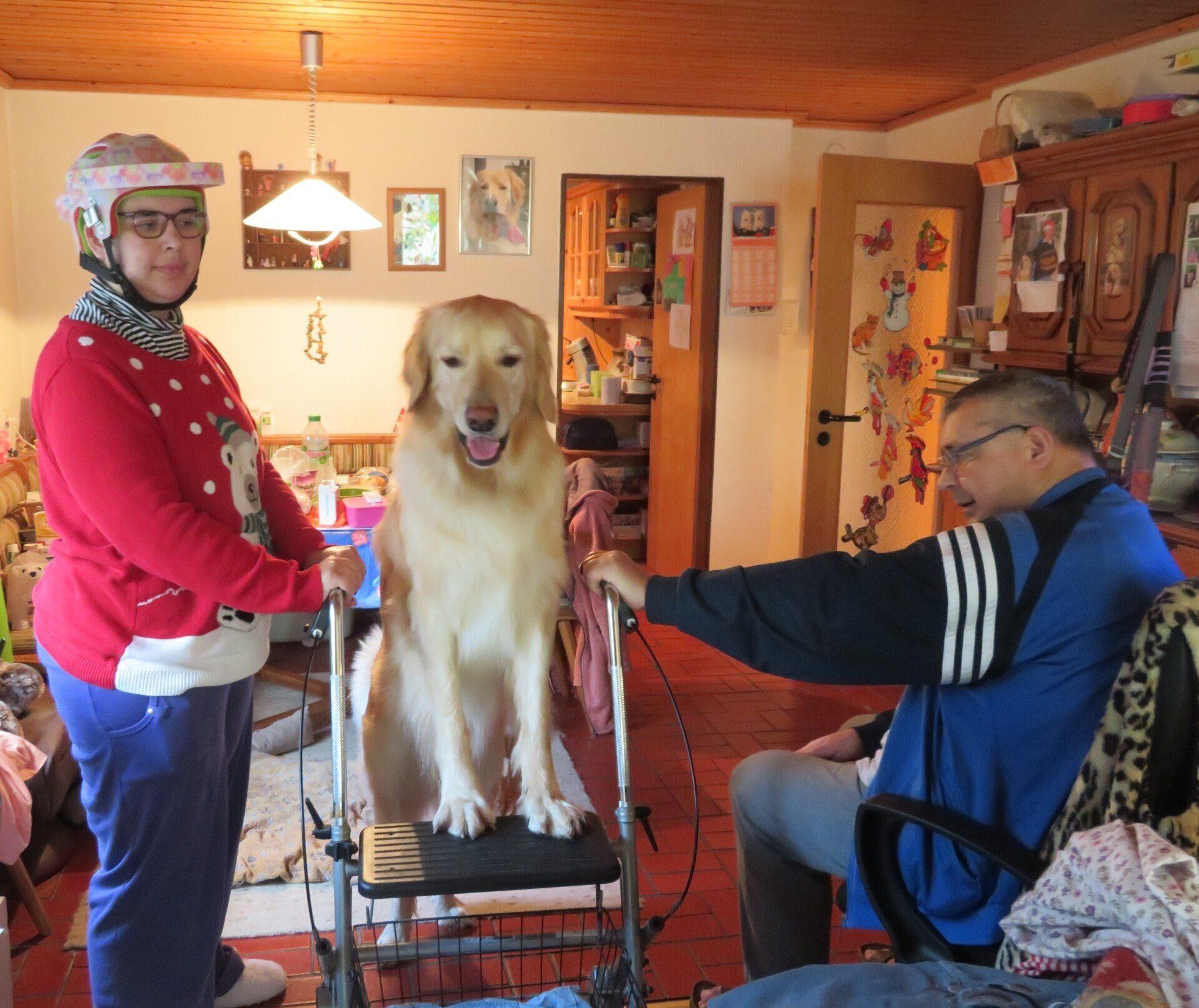 Hier seht ihr meine Trainingsbilder vom Umgang mit Krücken, Rollator, Greifzange, drücken, schmusen, knuddeln, mit und ohne Handschuh, mit und ohne Socken, apportieren von Plastikfläschchen, leeren Joghurtbechern usw. Tamara lehrt mich auf Zeichen zu reagieren (auf Kommando bellen oder auf Zeichen irgendwelche Kunststückchen zu machen)...wir lassen uns immer wieder was Neues einfallen - aktuell lerne ich "Männchen machen" auf Wort und Zeichen" oder ganz eng um die Beine herum zulaufen...rechts rum, links rum und rundherum....(ach Frauchen wird es schon wieder schwindelig!)...ach ja, und kennt ihr schon die "Garage"??