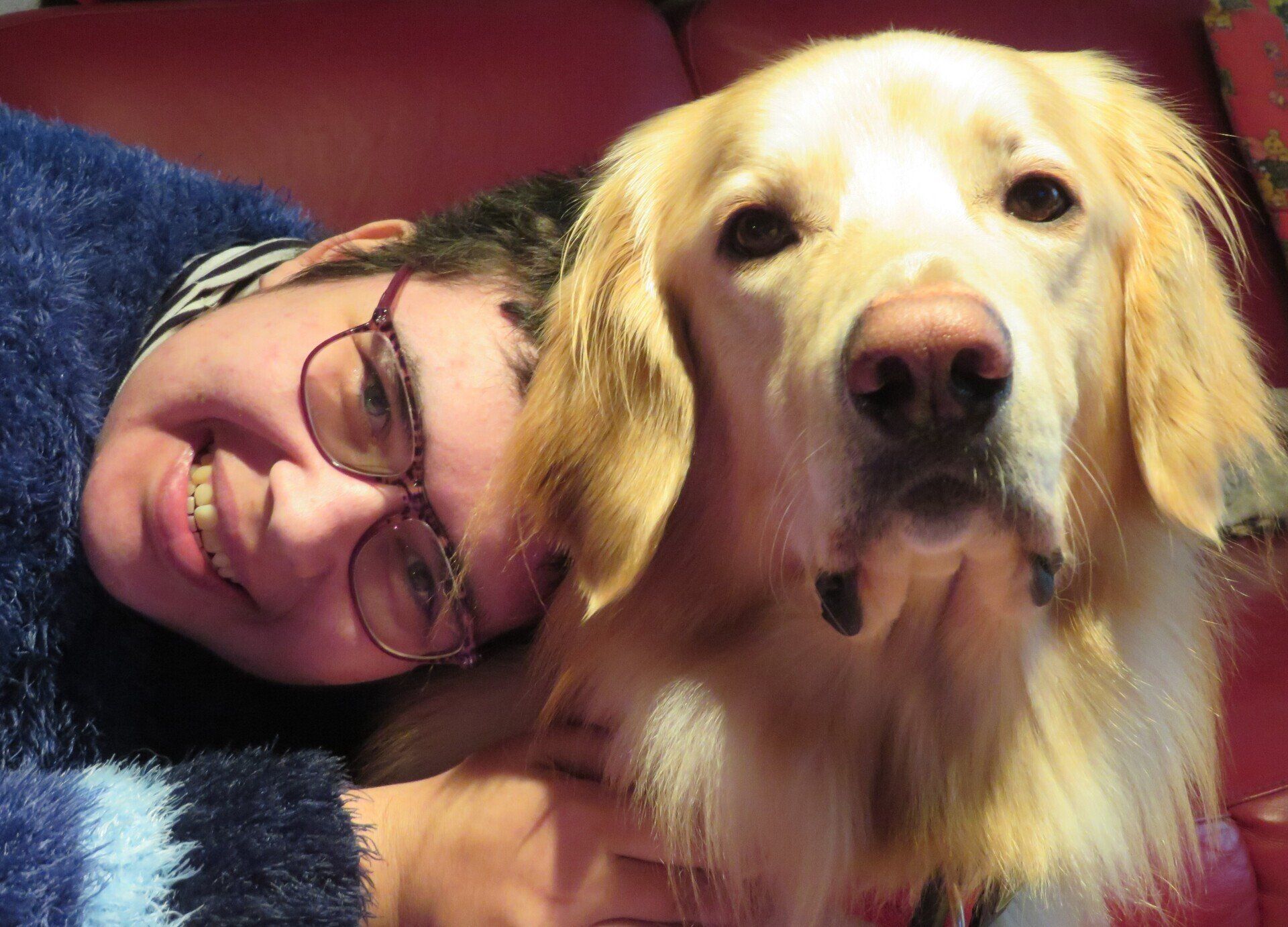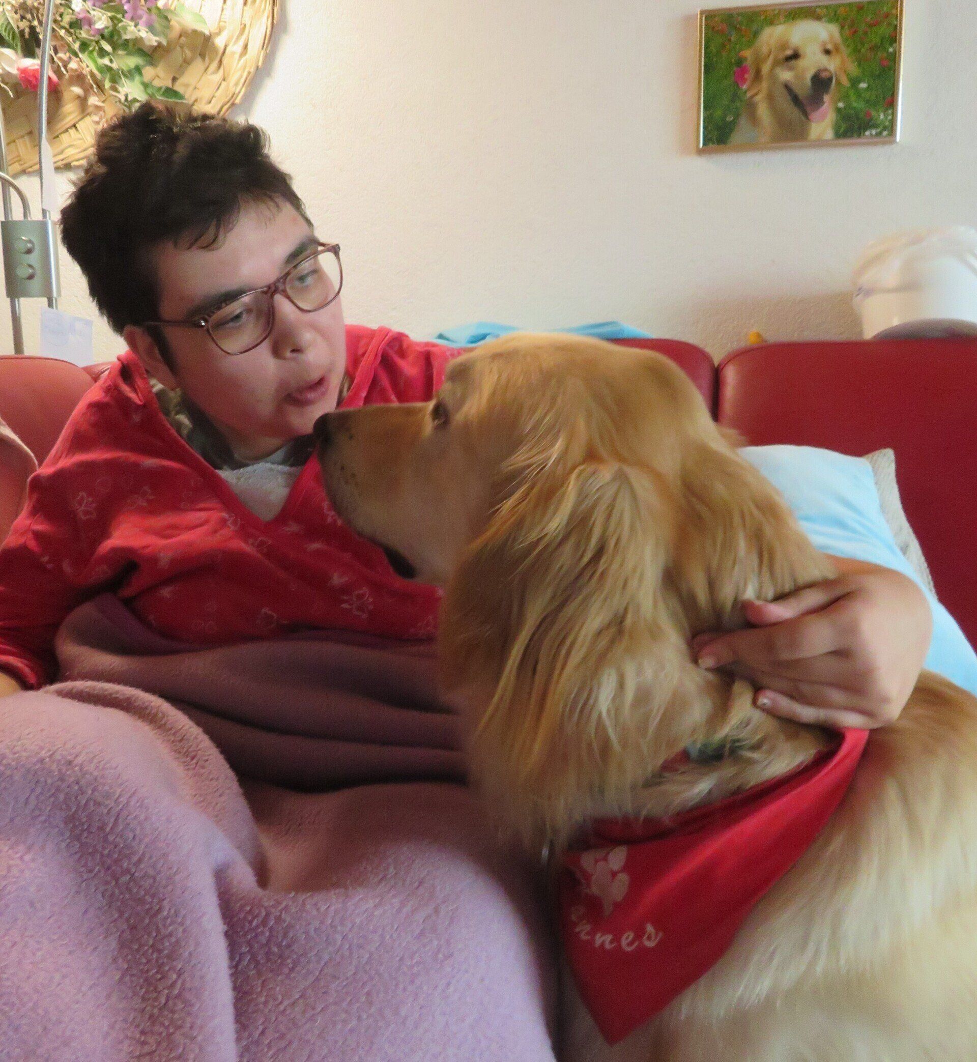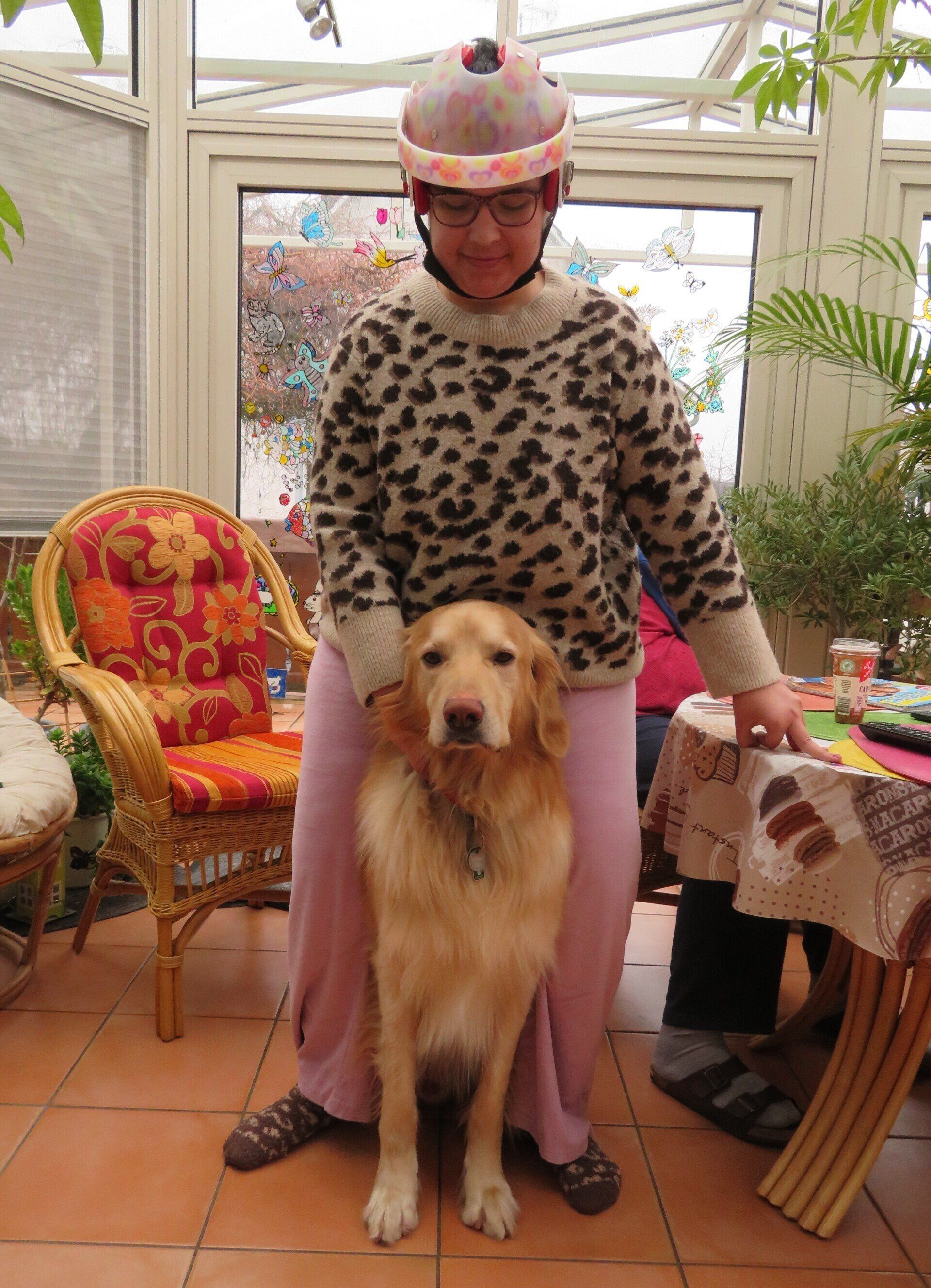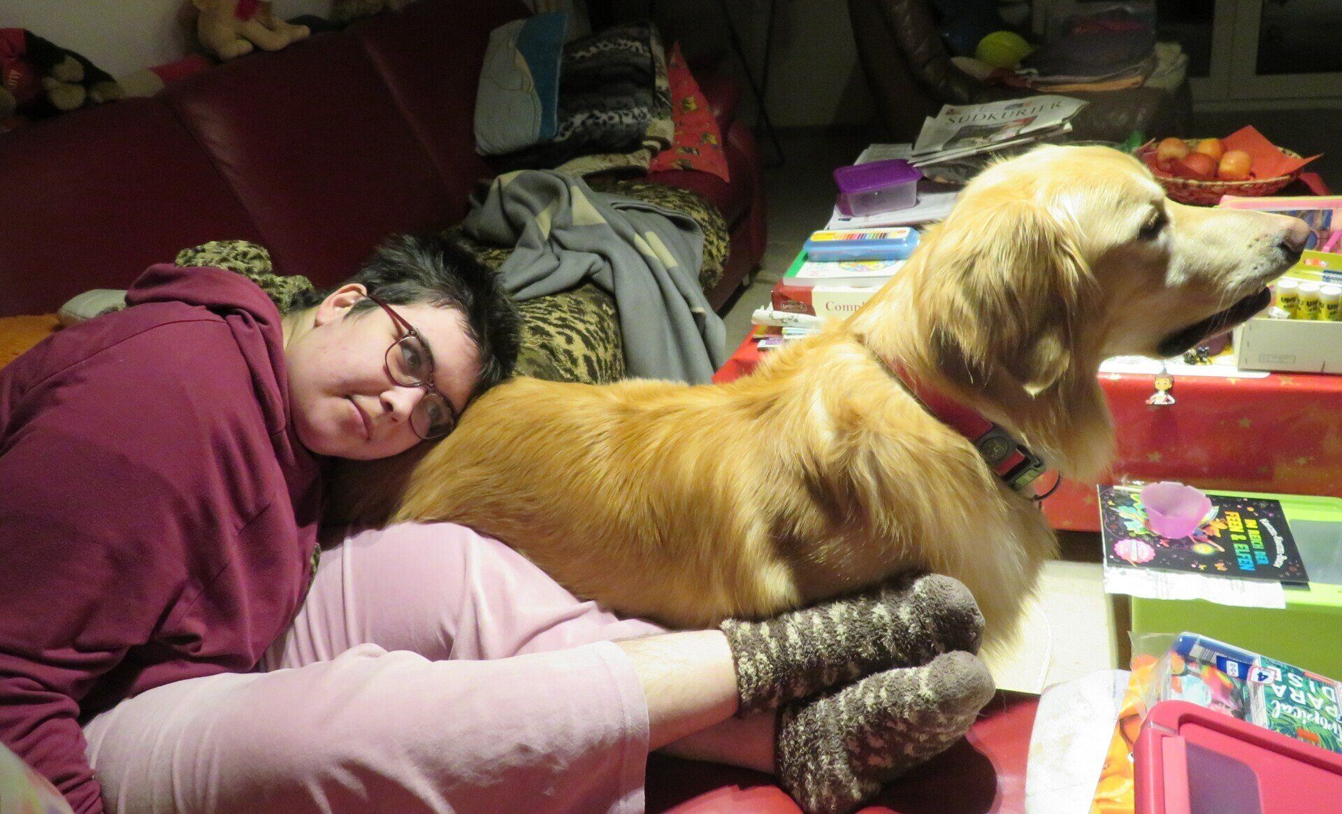 Mitte November 2021: - ...meine Tamara sitzt auf dem Sofa und bastelt- plötzlich ein tonischer Anfall mit Tremor, lautieren und heftigen Armbewegungen (Bastelschere, Kleber, Papierblock, Malfarben, Spitzer usw. fällt alles herunter)......sofort bin ich bei meiner Tamara und drücke ihr meinen Kopf fest gegen die Brust.....binnen Sekunden hat sie sich wieder beruhigt....jetzt werde ich sehr heftig geknuddelt und gekrault, ihre Finger bohren sich in mein Fell am Kopf und an meinem Hals. Tamara zieht mich nochmals ganz eng zu sich und umarmt mich richtig heftig..........wir haben uns einfach soooooooooo lieb.......