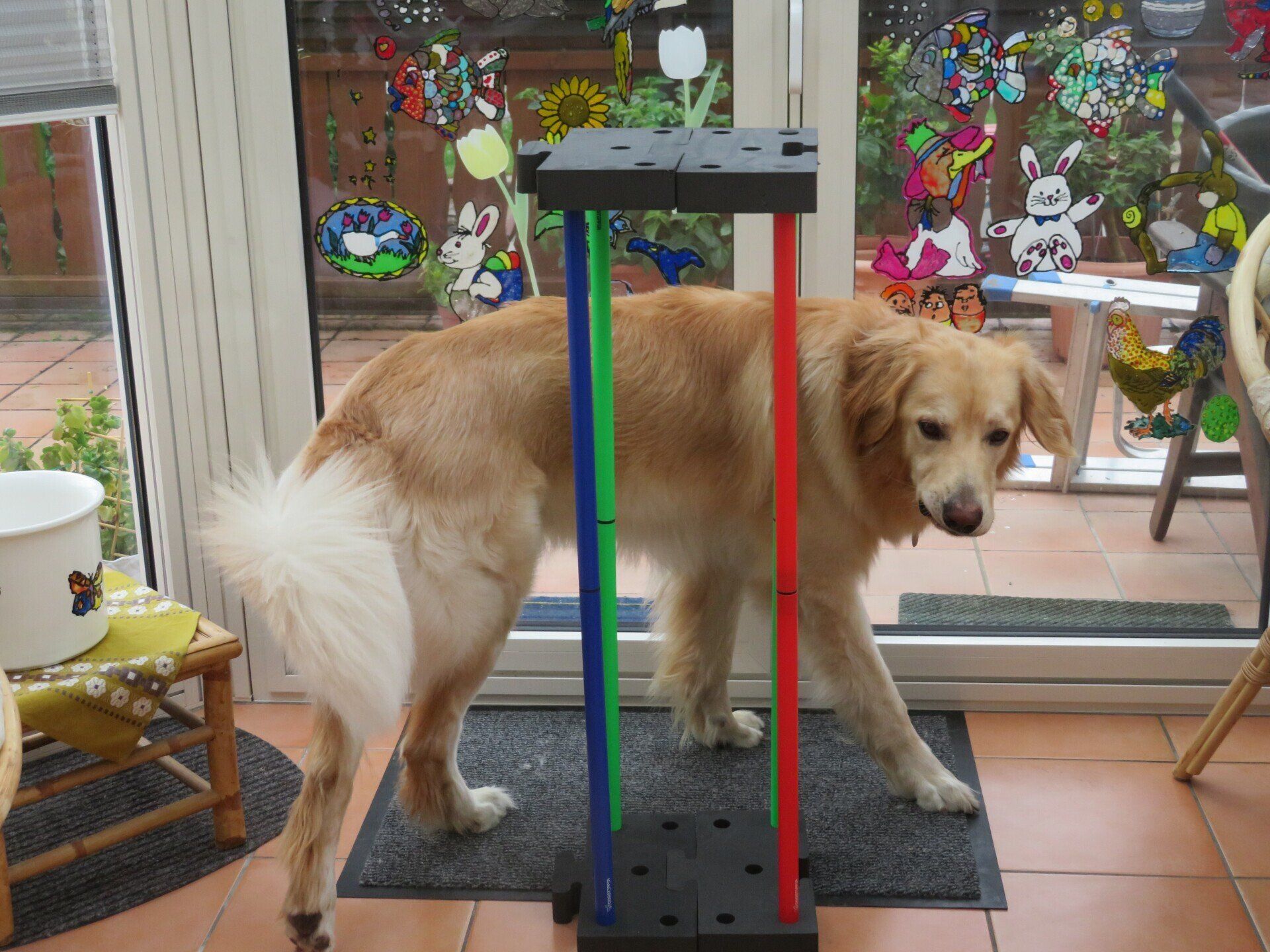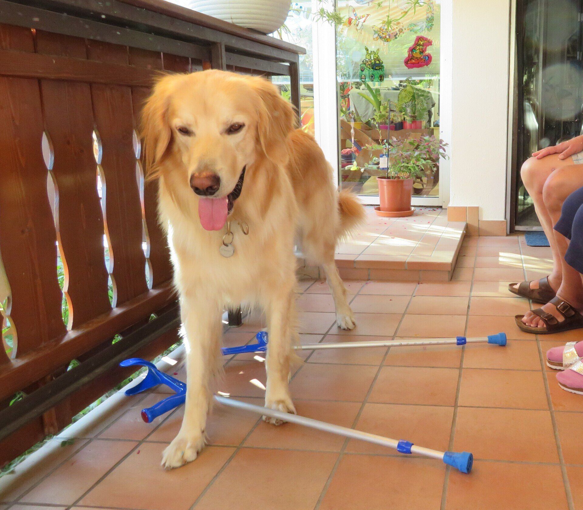 Ich werde an alles mögliche gewöhnt: an Krücken, Rollator, Rollstuhl, Greifzange in möglichen und unmöglichen Positionen, lerne anständig ein Leckerchen aus der Hand, vom Handschuh oder vom Löffel zu nehmen, ich werde heftig durchgeknuddelt an allen Körperstellen, ziehe sogar selbst Söckchen an. Ich kann sogar bei Frauchen oder Tamara oder irgendwem Socken ausziehen....und bringe sie dann in den Wäschekorb.....ich apportiere ja so gerne!!