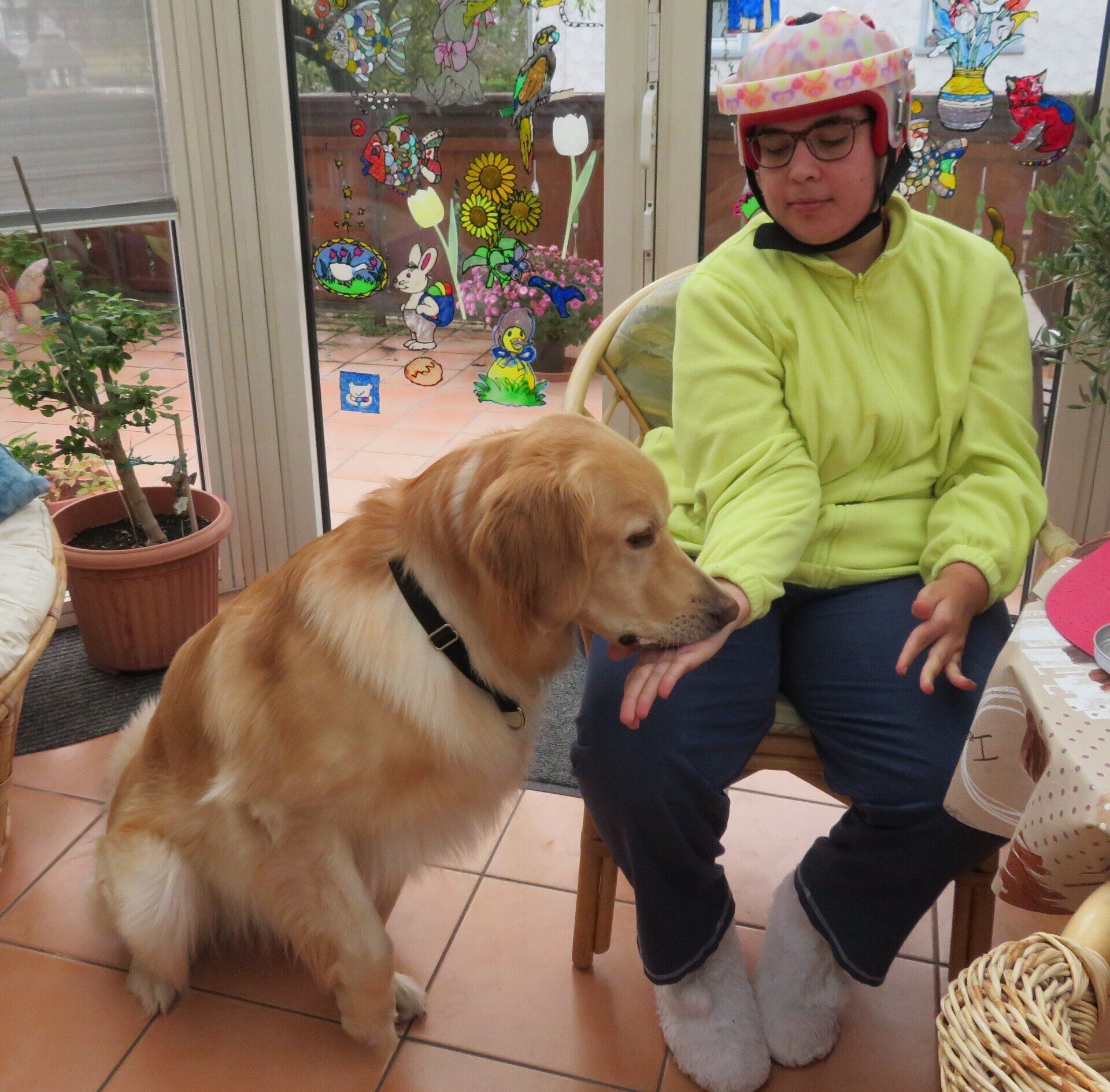März 2020: - Kurz nach dem Mittagessen- hupps!! Tamara stürzt, Frauchen steht grad zufällig nebendran und kann sie auffangen und ganz langsam auf den Boden gleiten lassen. Ich liege 20 cm hinter ihr und muss auch unbedingt liegenbleiben, da meine Tamara noch krampft und wild mit den Händen umherfuchtelt. Sie lautiert und speichelt....ist sekundenlang gar nicht bei sich (eine kleine Ohnmacht) und kann mich in dem Moment auch nicht wahrnehmen - ich warte ab! - Tamara setzt sich langsam wieder auf, wurschtelt noch an ihrem Pullover herum und ihre Blicke suchen etwas!...mich!!! Ganz behutsam rutsche ich an ihre Seite und lege meinen Kopf in ihren Schoß ...jetzt kann sie mich gut streicheln, drücken und schmusen - ein tolles Gefühl, für uns beide!!
