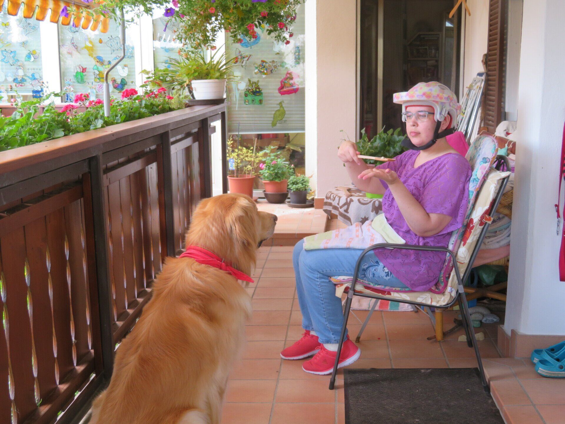 Februar 2021: - morgens beim Frühstück. Meine Tamara bekommt einen tonischen Anfall, klappt mit dem Oberkörper über dem Teller zusammen. Gleich neben dem Frühstück liegt schon die Morgenration der Medikamente zum einnehmen. Sofort bin ich bei Tamara und stütze sie mit meinem Kopf, denn sie droht unter den Tisch zu rutschen. - Geschafft - nix passiert!! Auch die bunten Tabletten, die direkt vor meiner Nase liegen, darf ich nicht nehmen......auf gar keinen Fall ....!! Sie liegen immer noch in einem kleinen Schüsselchen und können nun eingenommen werden. Gelernt ist gelernt und sitzt bombenfest!!