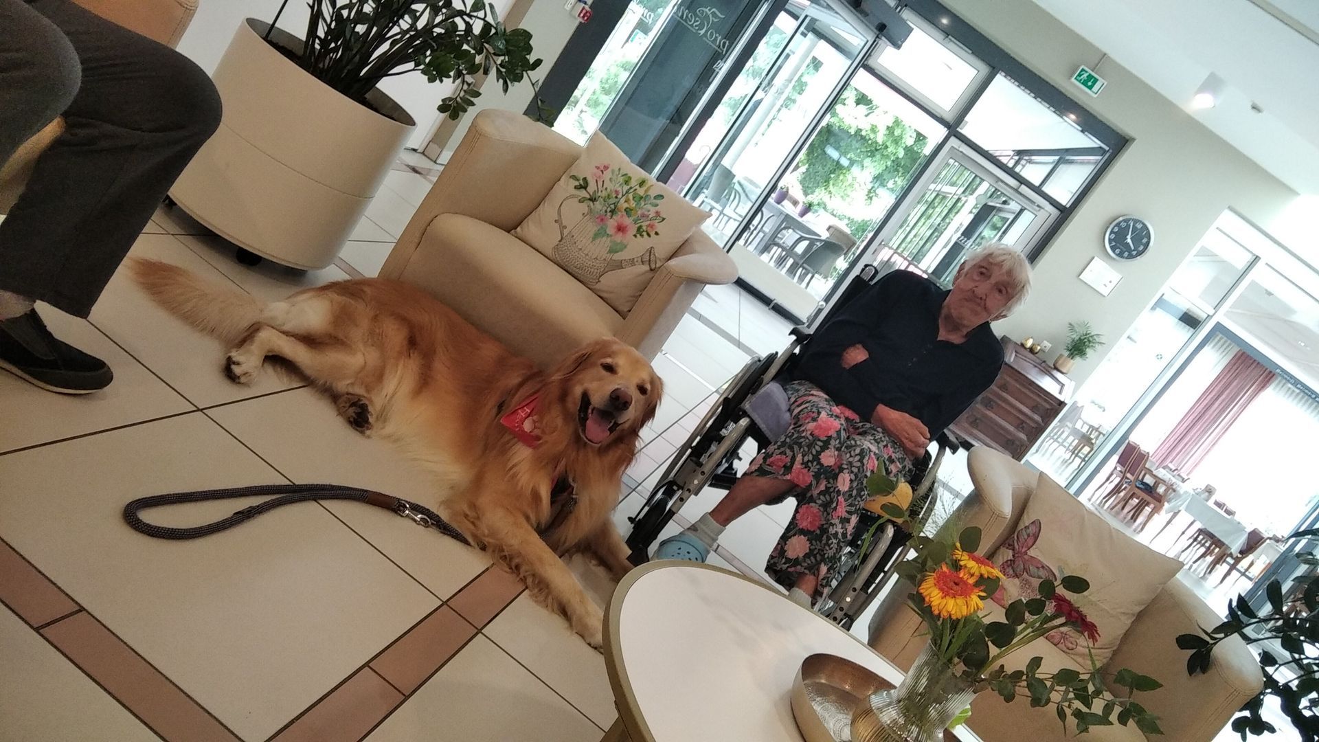 Mitte Oktober 2023: nach einem langen, heißen Sommer und dem Umstand, dass Frauchens Mutter (unsere OMA) verstorben ist, war ich endlich wieder in der Seniorenresidenz. Sieben bezaubernde Seniorinnen warteten schon ungeduldig auf mich, jeder will mal und konnte von mir gar nicht genug bekommen!